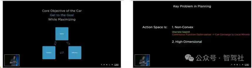 为了解决这些问题,特斯拉将规划问题分解为两层。首先,使用离散搜索方法来降低非凸性问题,缩小选择范围,避免陷入局部最小值。然后,对于高维问题,特斯拉采用连续优化方法,利用基于梯度的技术快速找到解决方案。这种方法的效率较高,因为它可以利用梯度信息,而不是逐点评估每个点的好坏。