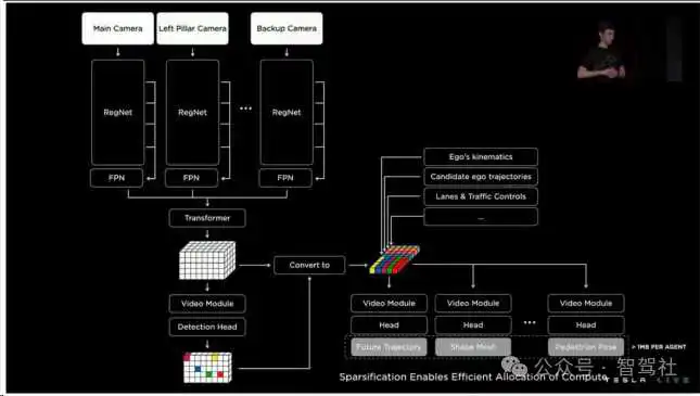 - 感知模块:采用HydraNets架构,整合多个视觉识别任务到单一网络,通过BEV(Bird's Eye View)+ Transformer技术,实现对车辆周围环境的感知。