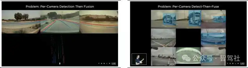 特斯拉在自动驾驶领域的早期技术方案中,首先在二维图像空间完成对环境的感知,然后将这些二维图像信息投射到三维向量空间中。由于摄像头捕捉到的数据本质上是二维的,与实际的三维物理世界存在差异,因此要实现完全自动驾驶,必须将这些二维数据转换到三维空间中去。在这一过程中,特斯拉面临了巨大的挑战,尤其是在对每个像素深度信息的精确预测上,以及对于被遮挡区域的预测上。当物体被多个摄像头捕捉,且没有单个摄像头能完整捕捉到物体时,就难以实现对这些信息的准确融合,进而影响到对物体的准确预测。