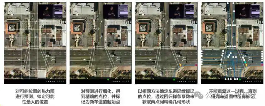 在这一方法中,不同的点位根据其在车道线中的作用被赋予不同的标记。例如,新车道线的起始点会被标记为起点,而车道线上的其他点则被标记为延续点。通过样条系数回归分析,特斯拉能够计算出车道线两点之间的精确几何形状。这个过程会不断重复,直到覆盖车道图中所有的关键点,从而构建出一个完整的车道模型。这种方法不仅提高了车道检测的精确度,还有助于提升自动驾驶系统在复杂道路条件下的导航能力。
