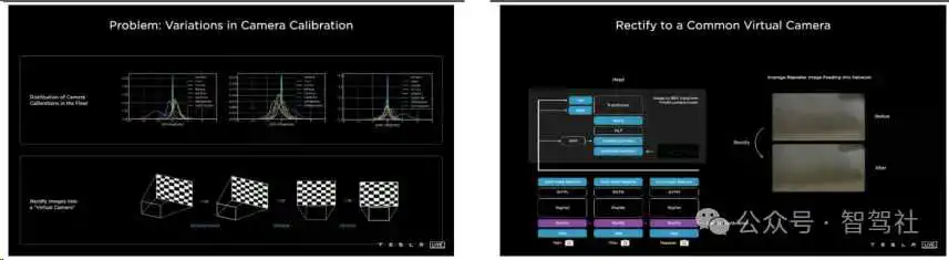 特斯拉在自动驾驶的感知框架中加入了一层虚拟标准摄像头,用以消除由于摄像头安装外参差异导致的微小数据偏差。这一过程涉及将每辆车采集到的图像数据通过去畸变、旋转等方式处理,然后统一映射到同一套虚拟标准摄像头坐标中。这样的校准(Rectify)确保了数据的一致性,为神经网络的训练提供了标准化的数据输入。通过这种方法,特斯拉能够提高感知系统的准确性和鲁棒性,确保自动驾驶系统在不同车辆和条件下都能可靠地工作。