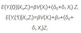 其中Yi(1) 和Yi(0) 分别表示当前研究个体i接受治疗和不接受治疗下的“潜在结局”,V(Xi) 是一个未知但单调的协变量函数,δ0 和δ1 是代表不同研究数据差异的参数,可以是常数或协变量的函数, βT 是待估参数。该方法的具体步骤如下:首先,基于PS进行匹配,先对当前研究的对照组及试验组进行匹配;然后,将当前研究试验组未成功匹配的个体与外部对照数据进行匹配;最后,再将当前对照数据与外部对照数据进行匹配。完成上述步骤后,对当前对照组与外部对照组匹配的数据拟合最小二乘法模型: