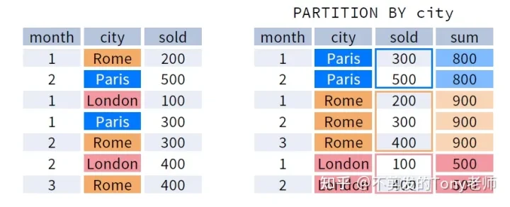 OVER 子句中的 ORDER BY 选项用于指定分区内的排序方式,与 ORDER BY 子句的作用类似;排序选项通常用于数据的排名分析。下图演示了按照 city 分区、按照 month 排序之后的数据: