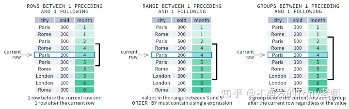 第一个窗口使用 ROWS 选项,包含了前后各 1 行以及当前行;第二个窗口使用 RANGE 选项,包含了当前行的数值减去 1(4-1=3)到当前行的数值加上 1(4+1=5)之间的所有数据;第三个窗口使用 GROUPS 选项,包含了前后各 1 组(ORDER BY 排序相同的数据为一组)和当前行。