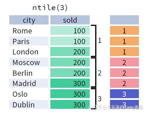 - NTILE(), 将分区内的数据分为 N 等份,为每行数据计算其所在的位置。