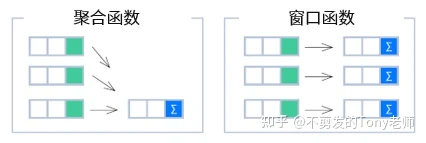 我们知道,聚合函数(Aggregate Function)用于将一组数据汇总成一个结果;而窗口函数则为每一行数据计算出一个结果。它们的区别如下图所示: