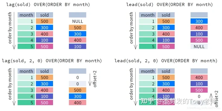 下图演示了 LAG(expr, offset, default) 和 LEAD(expr, offset, default) 函数的效果: