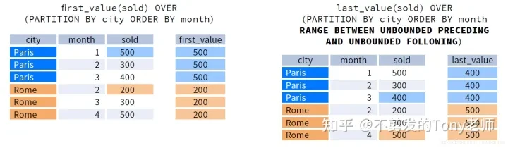 下图演示了 FIRST_VALUE(expr) 和 LAST_VALUE(expr) 函数的效果: