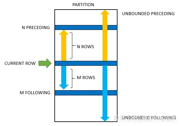 - N PRECEDING,窗口从当前行之前的第 N 行、范围 N 之内或者第 N 个组开始;