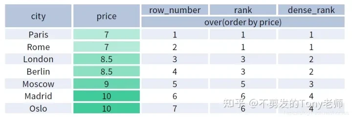 下图演示了 ROW_NUMBER()、RANK() 以及 DENSE_RANK() 函数的效果: