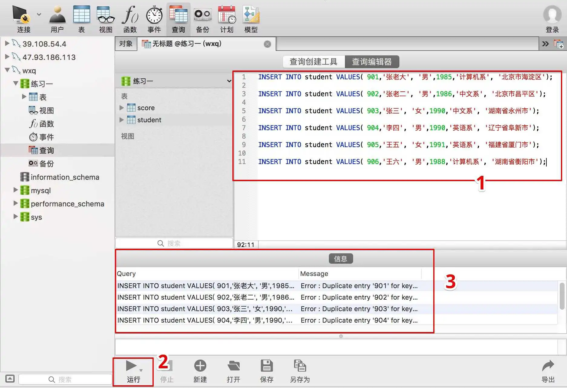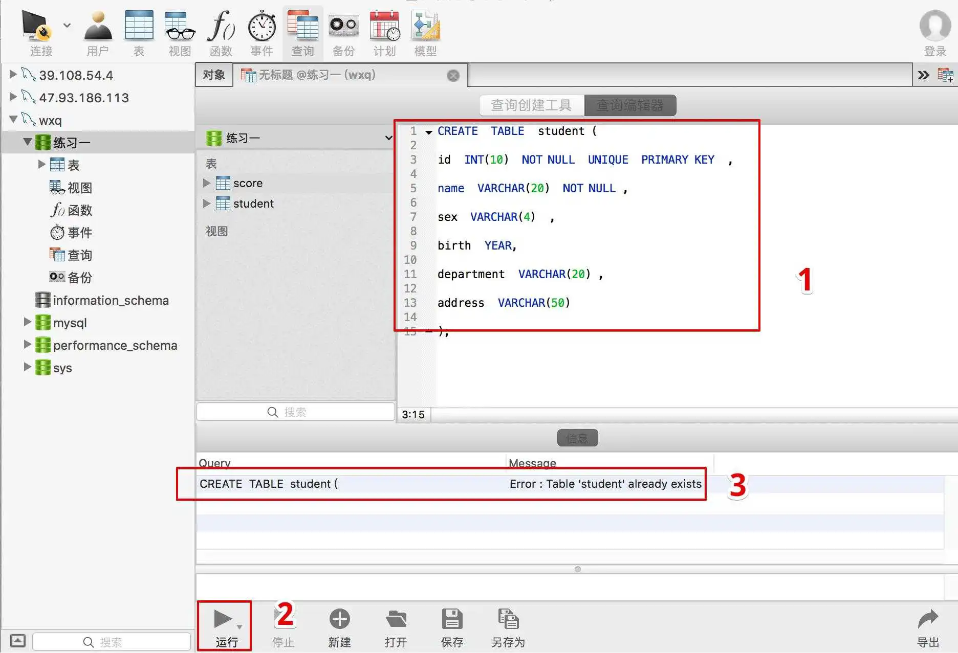 点击运行后,看到受影响的行、时间,就说明:新建成功!!!(因为我之前已经运行过,在结果信息栏显示了已经存在,可以在“表”查看“student”表)