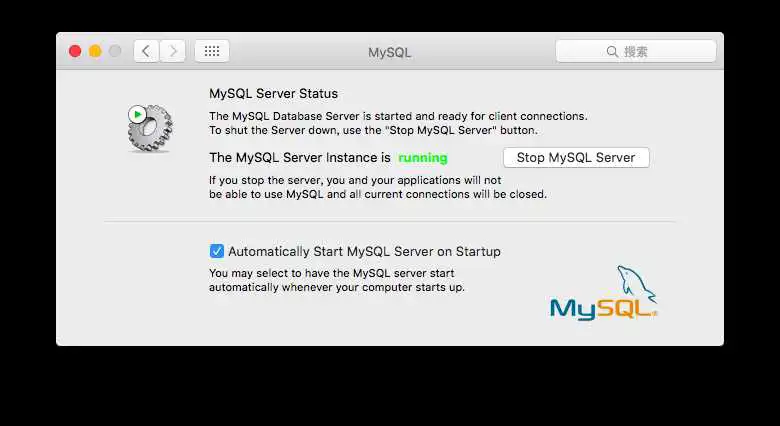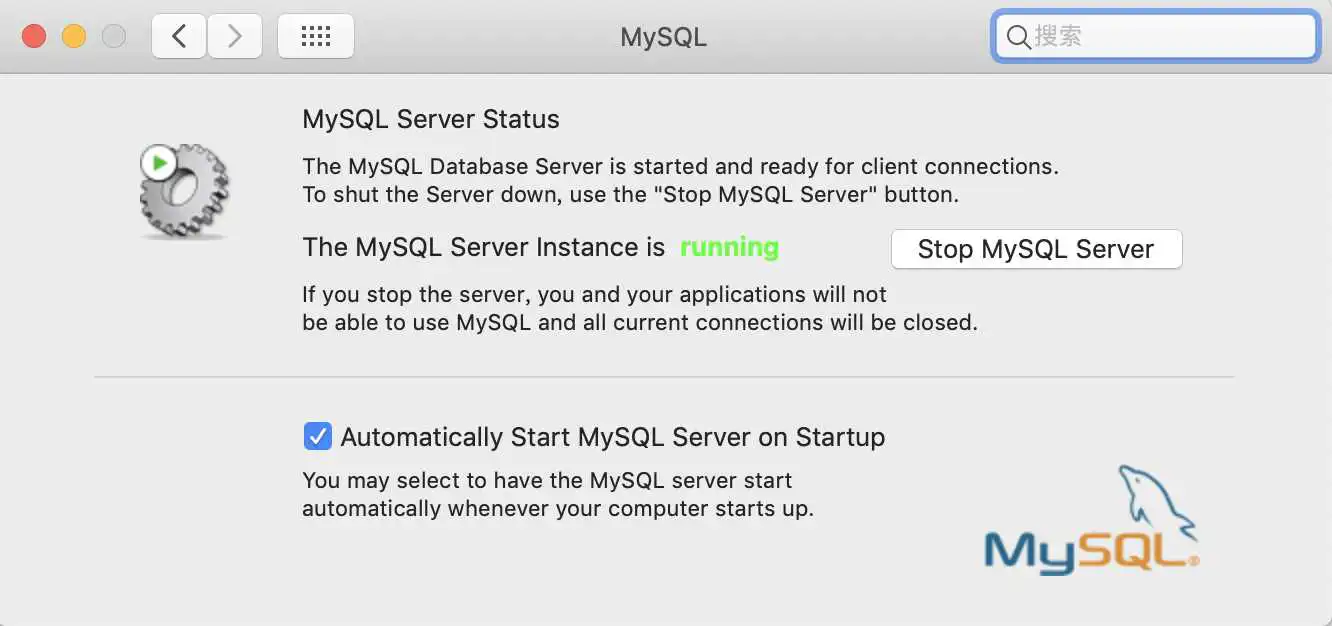 注:在此可以启动和停止MySQL数据库,同时还可以设置MySQL数据是否开机启动。