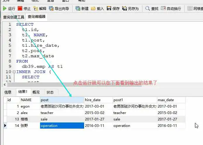 写在所出现的编辑框中——运行——得到运行查询结果: