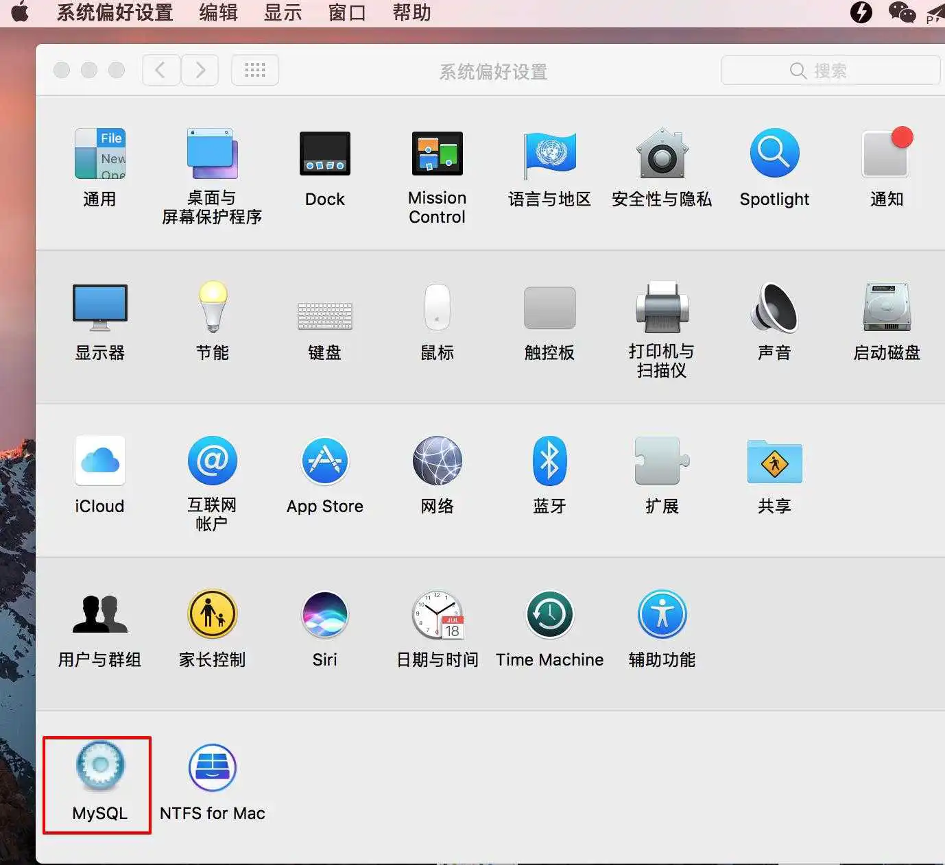 打开“系统偏好设置”,发现最下面多了MySQL控制按钮: