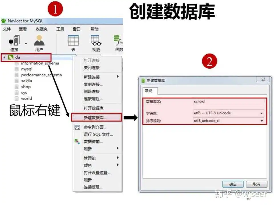 wxq——右键——新建数据库(图1),取名字(随意起,test1或者练习一),点击:好(图2)