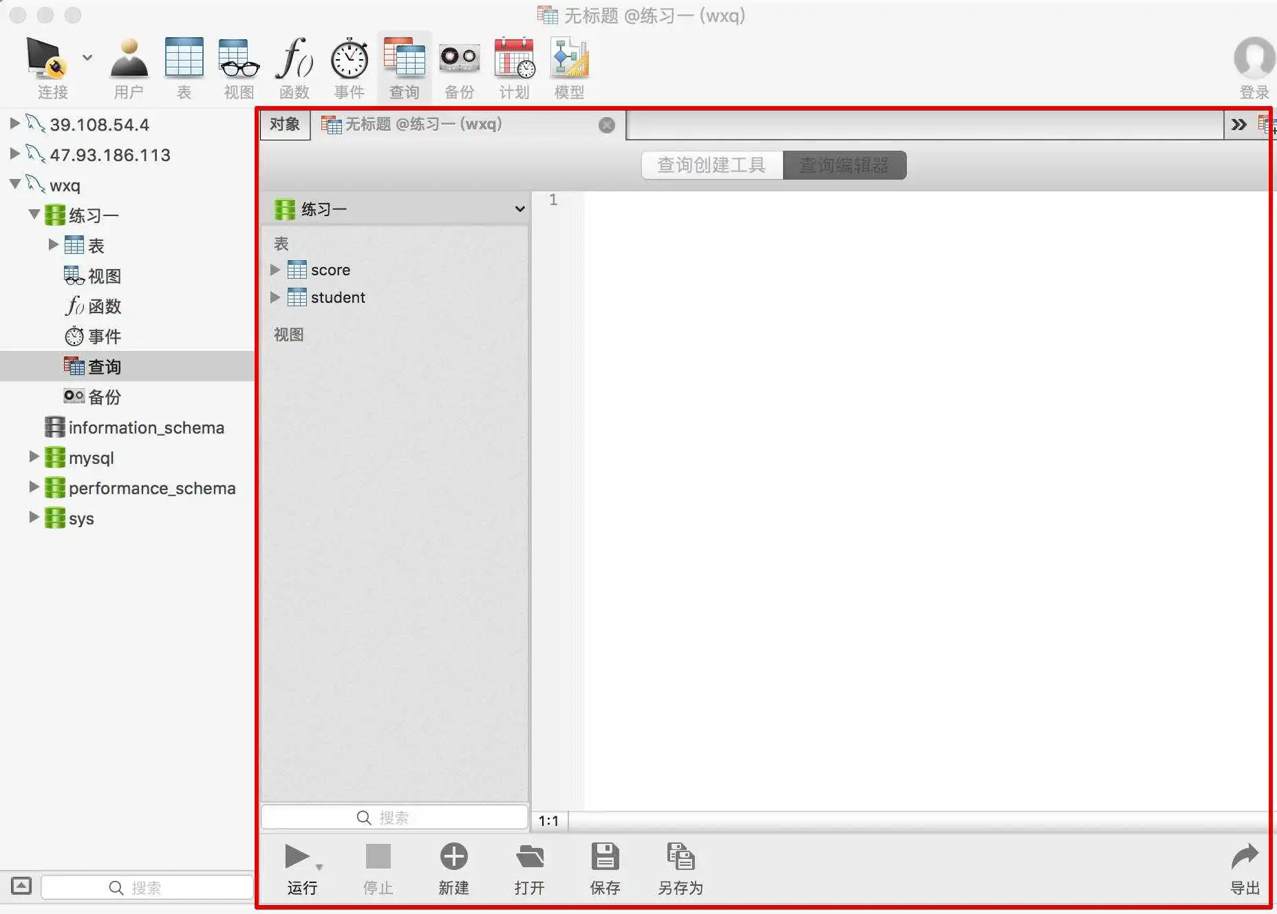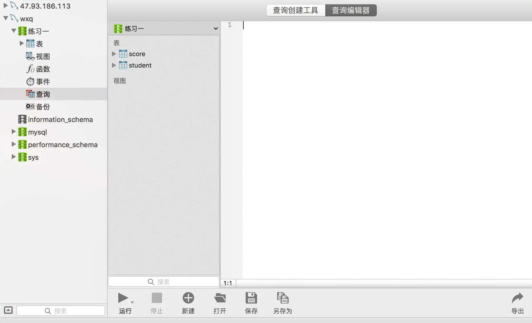 - step2:选中wxq,下拉就出现了刚才新建数据库——练习一,下拉练习题一,出现查询,右键——新建查询(图1):