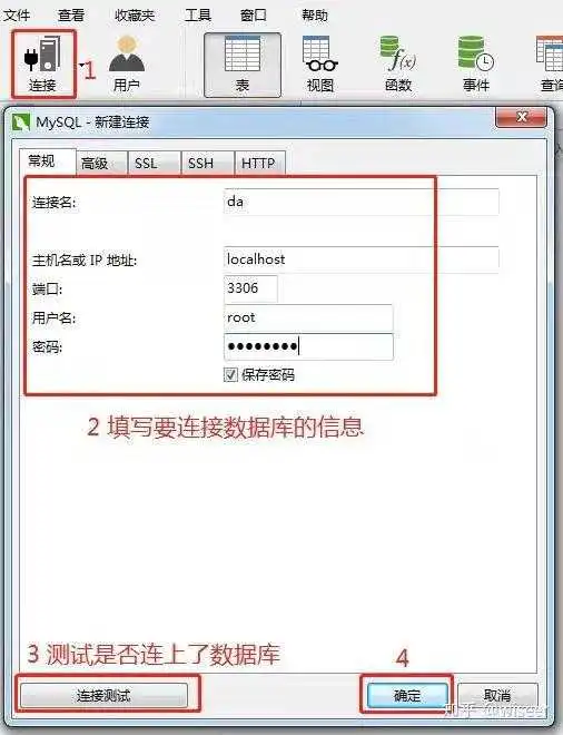 - 连接数据库:打开Navicat后,点击"新建连接"按钮,填写数据库连接信息,包括主机名、端口号、用户名和密码等。选择对应的数据库类型,点击"连接"按钮以建立与数据库的连接。