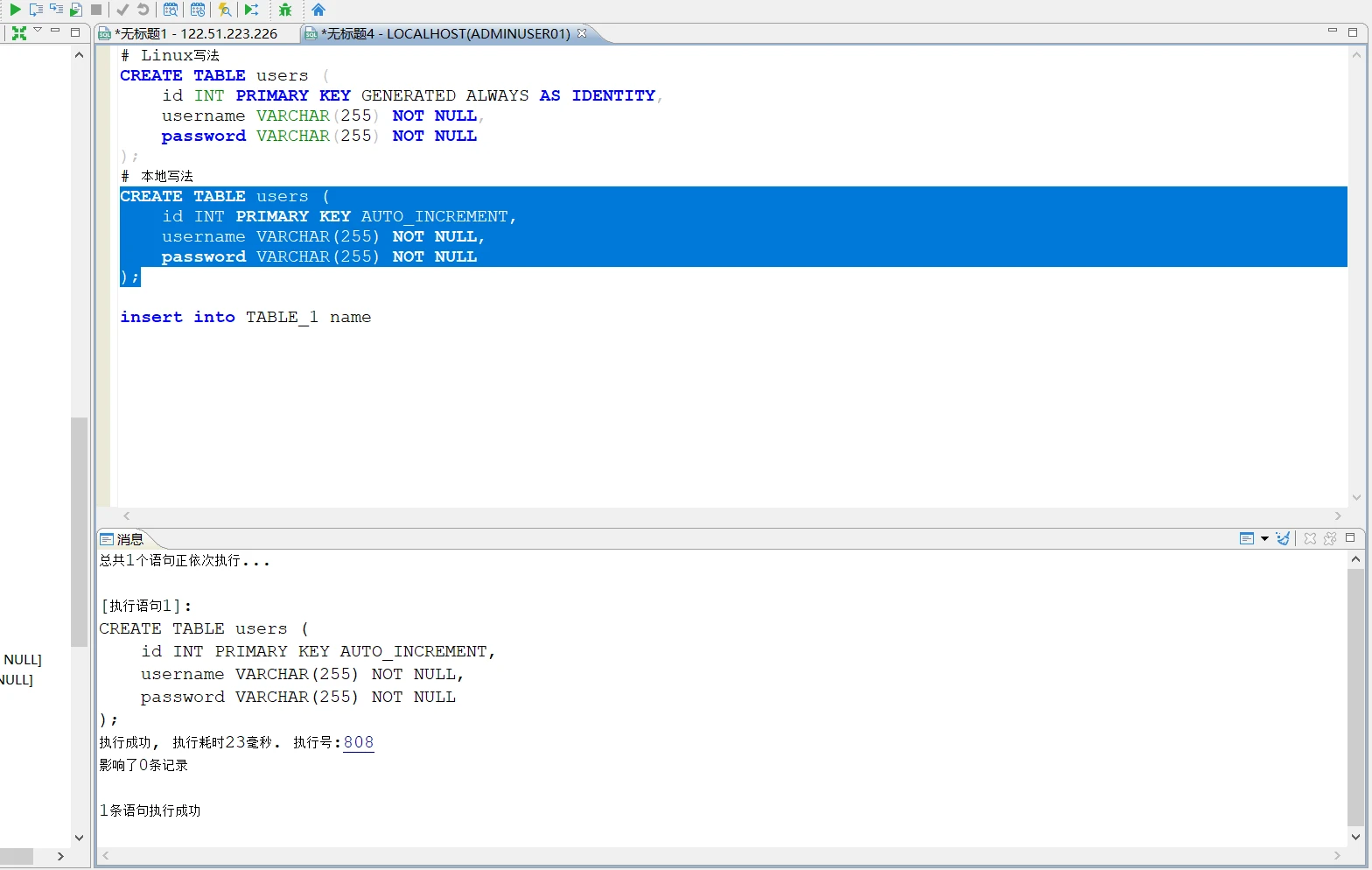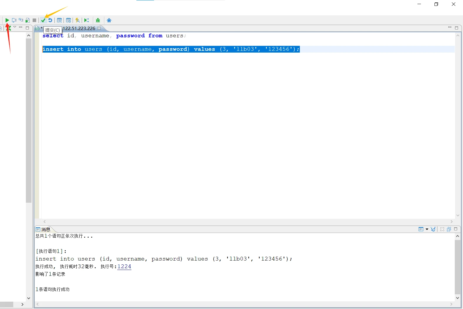 本地可视化连接服务器,执行SQL后成功了,但服务器无法查询到。是因为并没有实时更新到数据库。(执行SQL后点击提交)