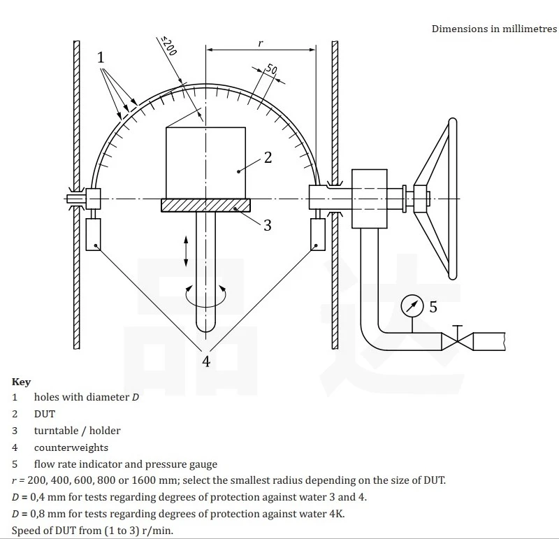6、 试验速度:IPX3完整摆动一次 (2X120°) 的时间约4s,IPX4完整摆动一次 (2X360°) 的时间约12s.