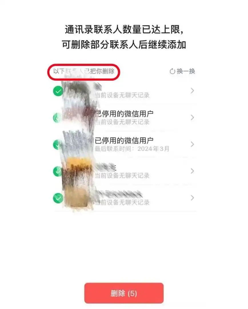 记者看到,多名网友晒出的截图显示,微信提示“通讯录联系人数量已达上限,可删除部分联系人后继续添加”,并给出几个联系人选项,用户可直接删除或选择“换一换”。