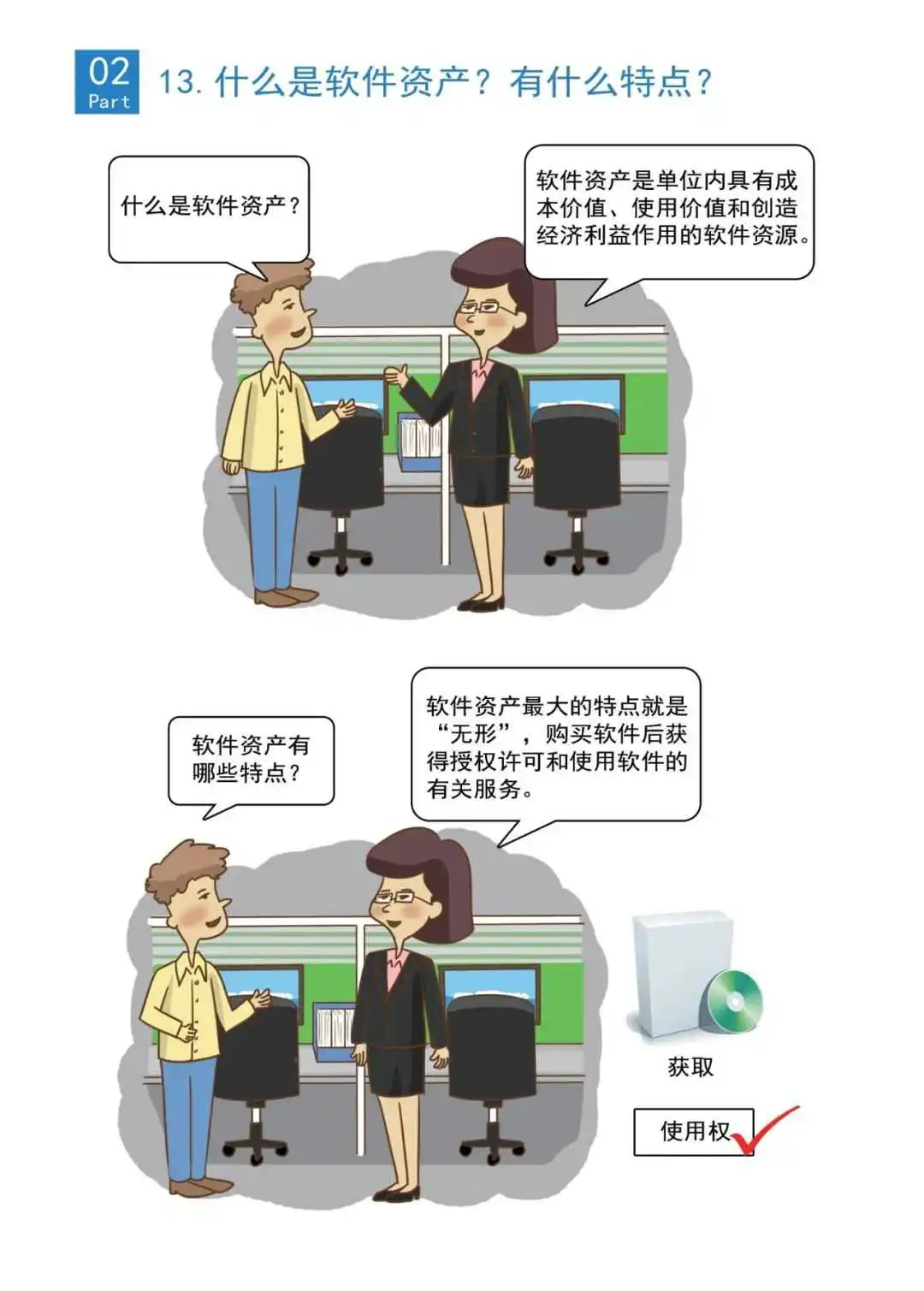 答:软件资产是单位内具有成本价值、使用价值和创造经济利益作用的软件资源。软件资产最大的特点就是“无形”,购买软件后获得授权许可和使用软件的有关服务。