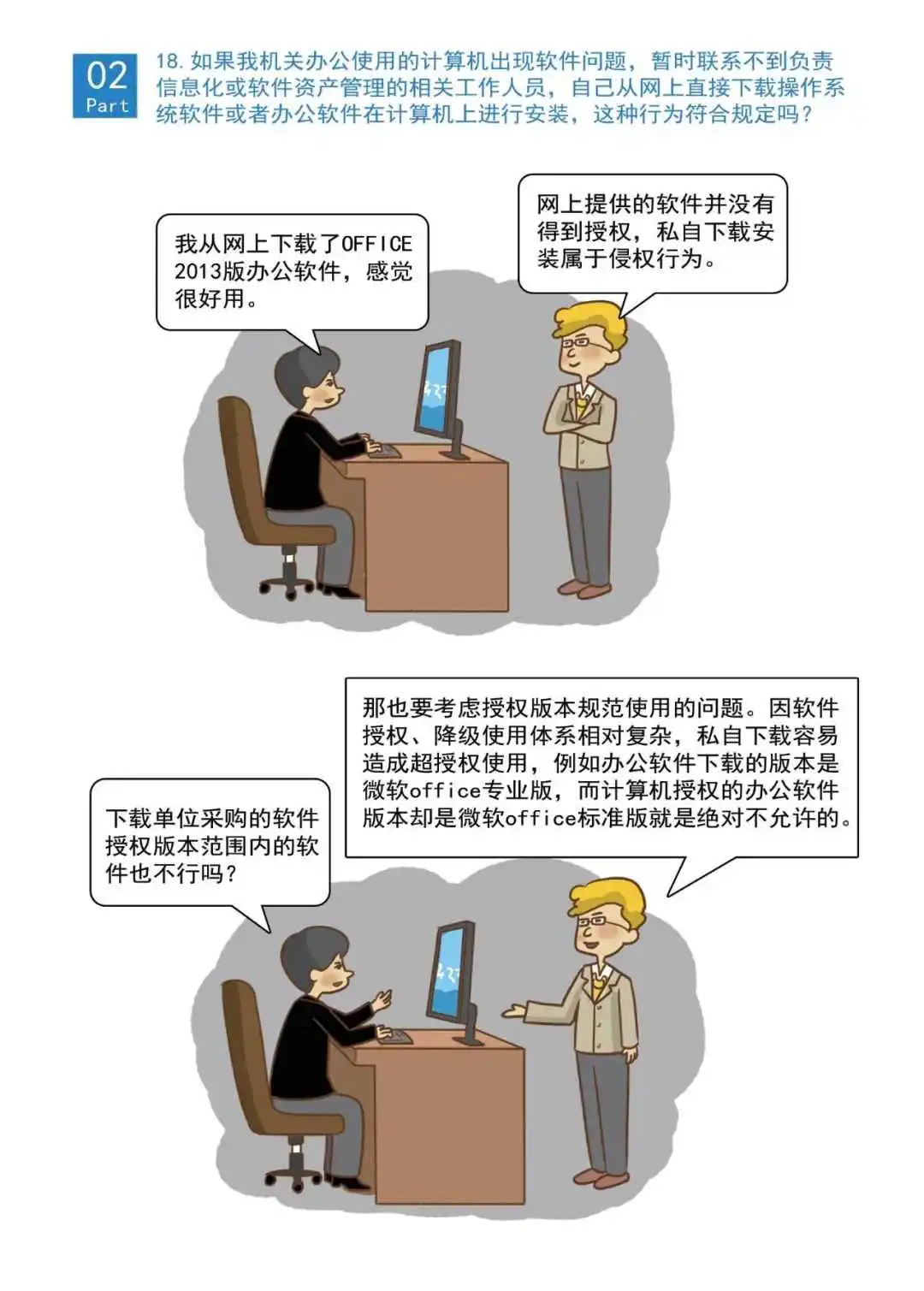 ★如果机关单位办公使用的计算机出现软件问题,暂时联系不到负责信息化或软件资产管理的相关工作人员,自己从网上直接下载的操作系统软件或者办公软件在计算机上进行安装,这种行为符合规定吗?下载单位采购的软件授权版本范围内的软件可以吗?使用网上免费授权的个人版软件呢?