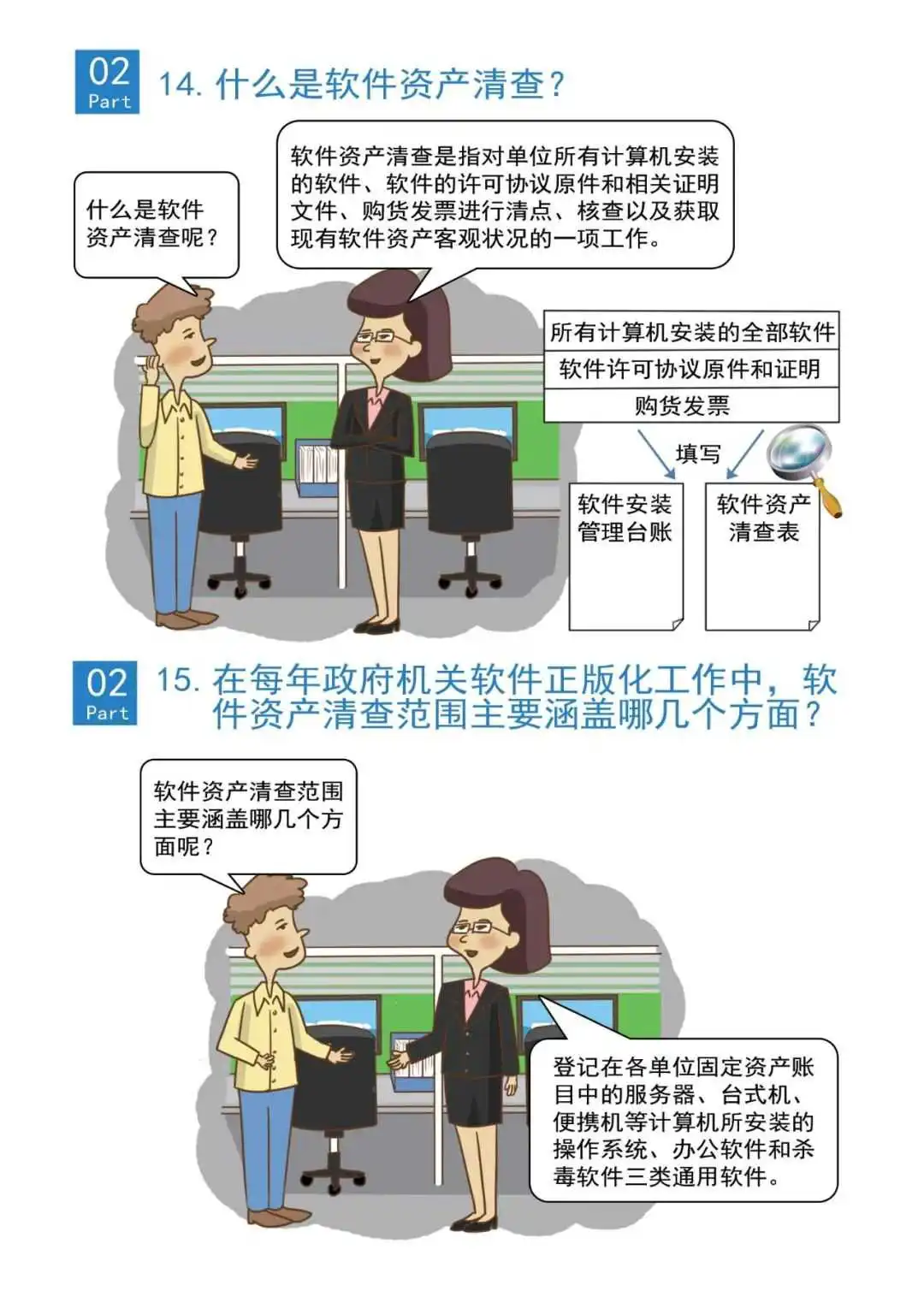 答:软件资产清查是指对单位所有计算机安装的软件、软件的许可协议原件和相关证明文件、购货发票进行清点、核查以及获取现有软件资产客观状况的一项工作。
