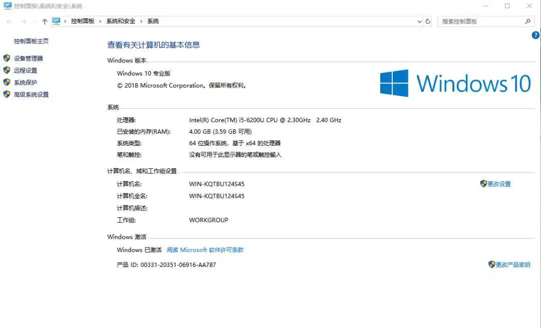 显示计算机安装的操作系统软件名称、版本为Windows 10 专业版,产品ID为00331-20351-06916-AA787。