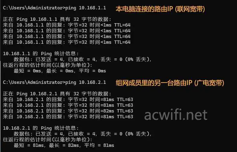 要看成功不成功,只要在一个成员下的终端ping另一个成员的IP就行。比如本电脑连接在10.168.1.1(联通宽带)下,ping另一台成员的路由IP:10.168.2.1,直接就能通过互联网ping通了。(从延时也可以看出)