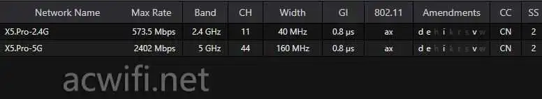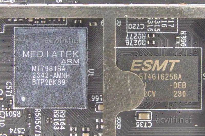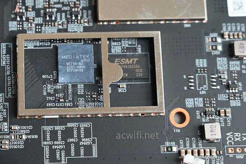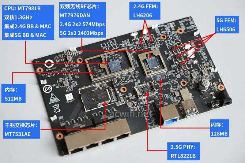 蒲公英X5Pro的CPU型号j是MT7981B,双核1.3GHz,12nm制程,同时CPU内部集成了2.4G和5G的MAC和BB,2.4G支持2x2MIMO,最高速率574Mbps,5G支持2x2MIMO,最高速率2402Mbps: