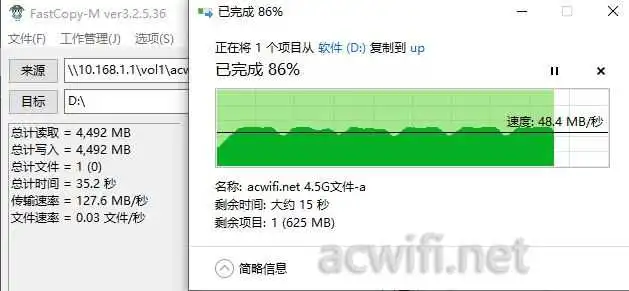 把U盘分别格式化为exFAT和NTFS格式进行测速。测试方式是在win10系统下利用FastCopy软件进行文件的复制和粘贴,从而测出传输文件的速度。由于exFAT文件格式在WIN系统下,读取的时候会有10多20秒的无速度响应,所以用WIN10自带的进度条取末端做平均值。(这个跟路由器没有关系,其它路由器都会这样。)