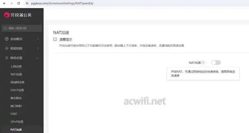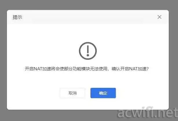 而且要在云管理里面才有这个选项,本地WEB界面没有找到。关闭NAT加速时的提醒: