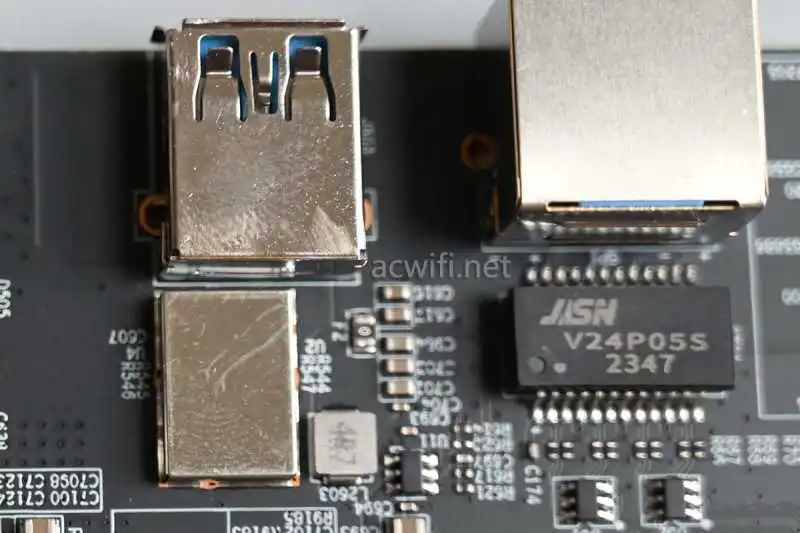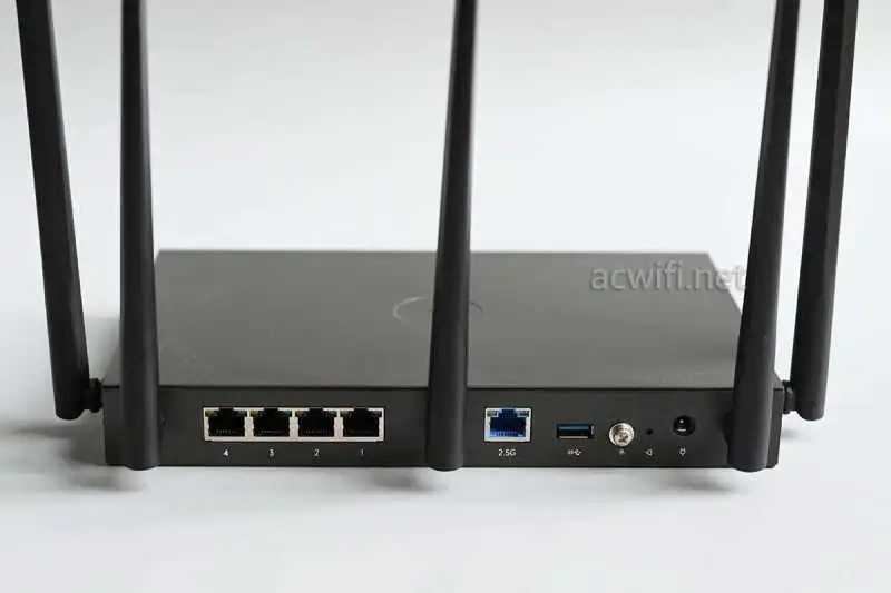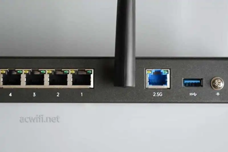 四个千兆网口和一个2.5G网口,2.5G可以做WAN也可以做LAN。一个USB3.0接口,一个接地线端子。