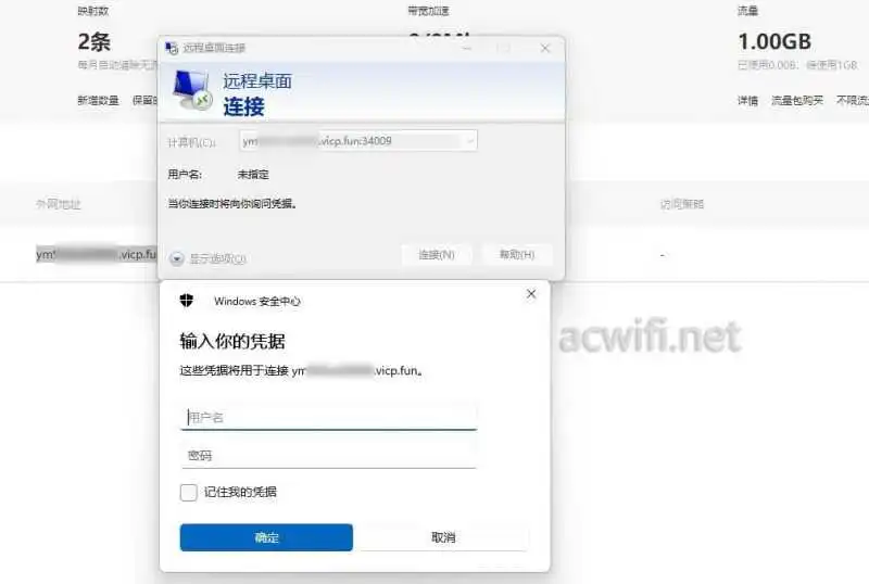 远程桌面里填入域名和端口号,连接成功: