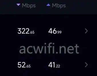 路由器放在室内,插上随身Wi-Fi设备后,用手机连接路由器的5G Wi-Fi ,插5G随身Wi-Fi 测得的速度是322兆下行46兆上行,4G是52兆下行,41兆上行。
