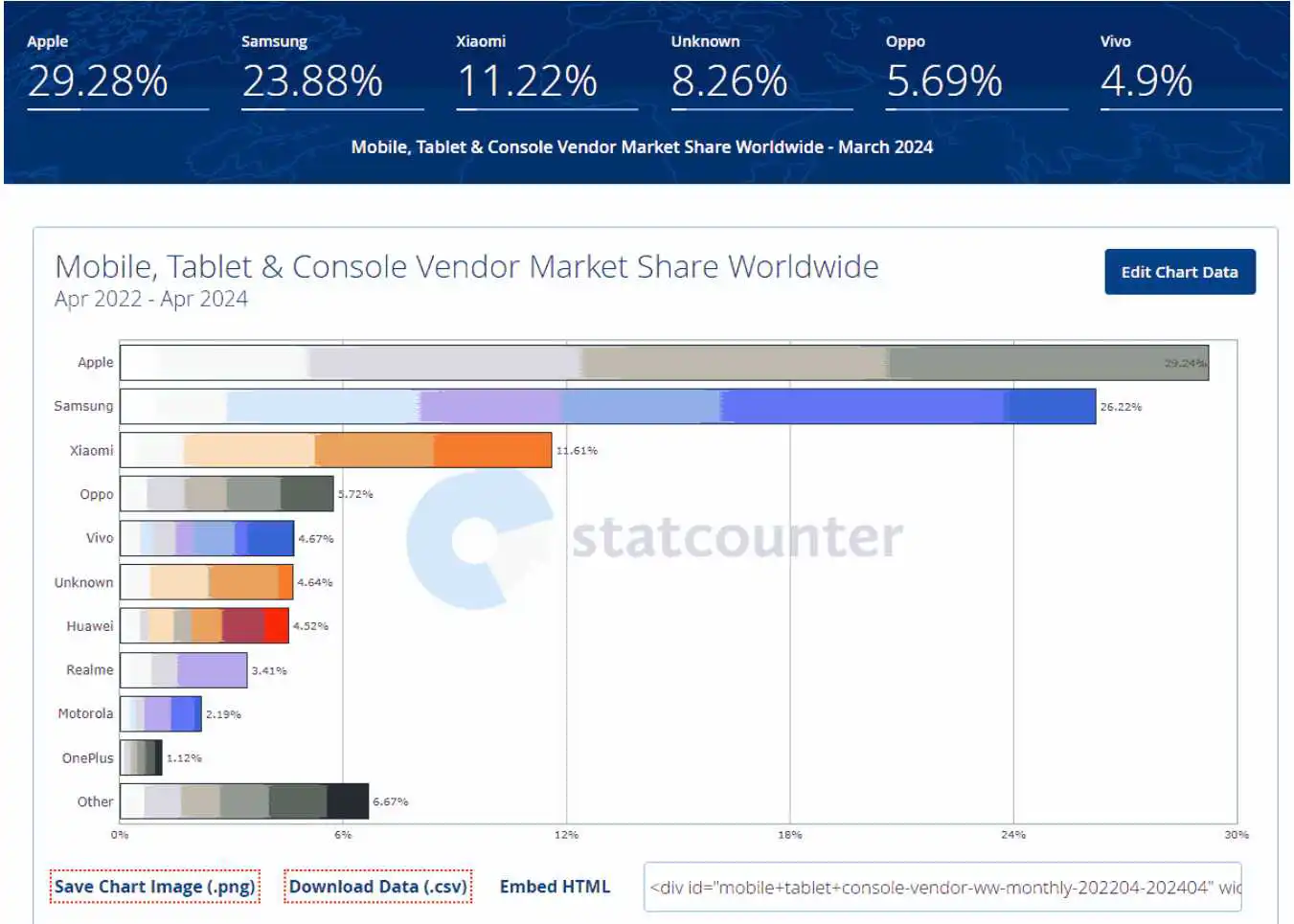 如果我们看看移动设备市场,就会发现它是高度分散的。这可以从下面的统计数据中看出: