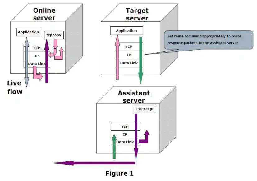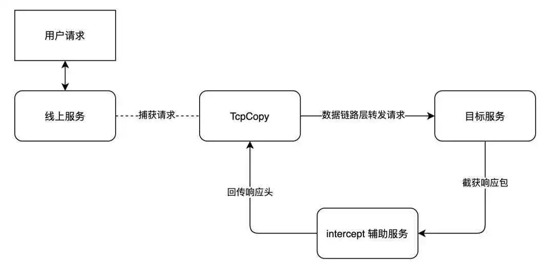 TcpCopy主要有tcpcopy和intercept两个模块组成,tcpcopy模块运行在线上机器,主要负责捕获在线请求并修改请求头中的目标地址和 源地址,然后使用raw socket输出技术发送数据包到目标服务器。目标服务器上根据配置的信息将响应数据包路由到intercept辅助服务器。intercept辅助将提取的响应头信息发送给tcpcopy。tcpcopy利用收到的信息修改捕获的数据包属性并发送至目标服务器。