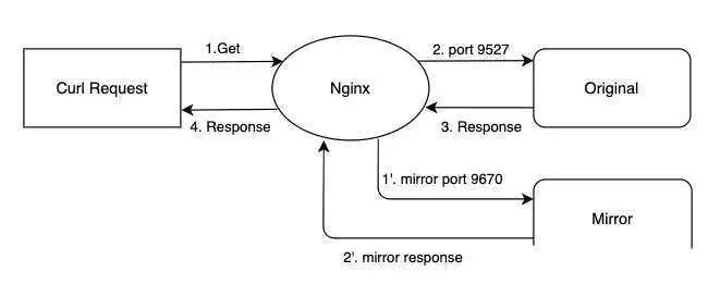 流量请求到nginx后,nginx正常转发请求到目标应用,同时复制流量到mirror服务后不再管控。
