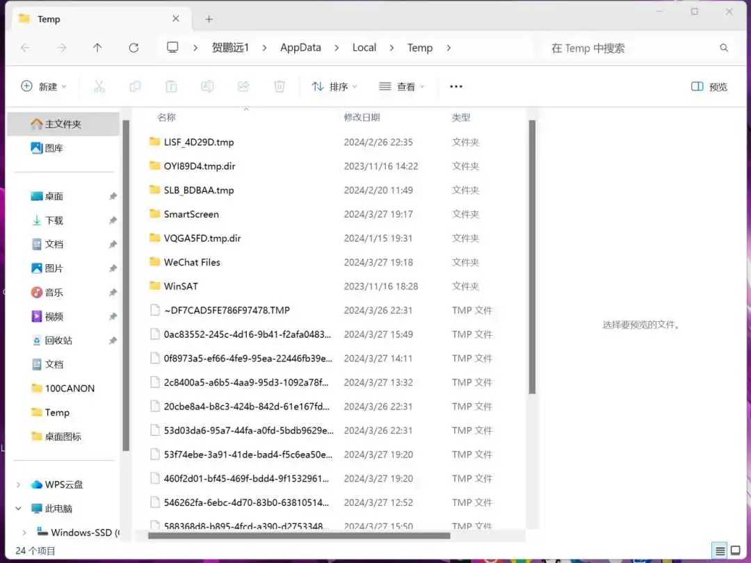 回车确认,此时会打开temp临时文件夹,可以删除文件夹中的缓存垃圾,释放电脑空间。