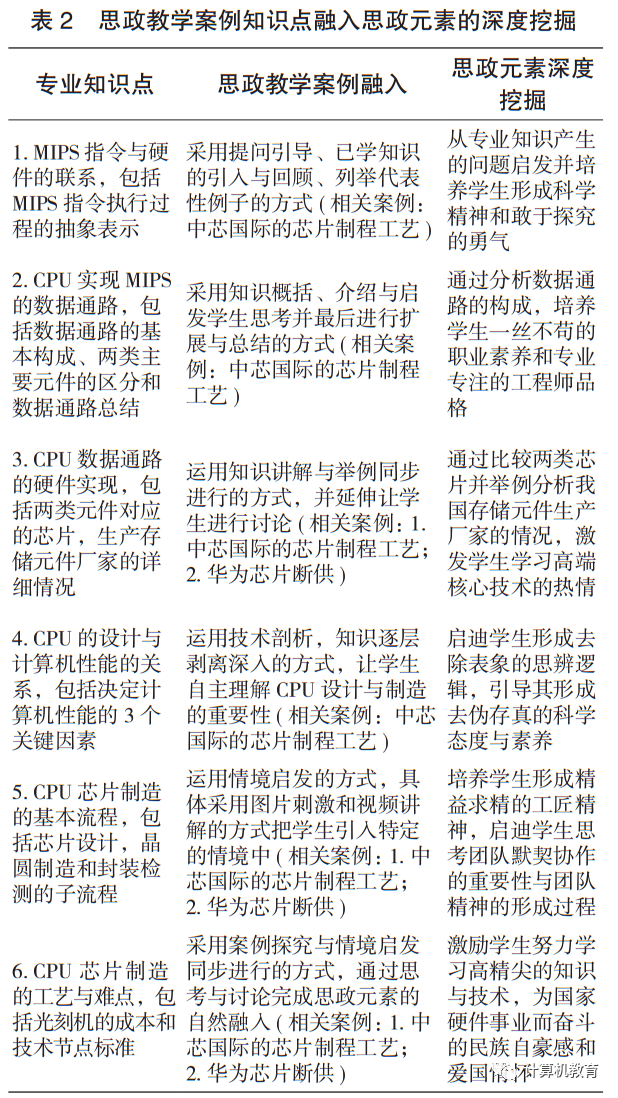 本课堂包括6个知识点,可以围绕6个知识点提供两个案例。第1个案例是“中芯国际的芯片制程工艺”,该案例是一个描述中国芯片制造工艺与国际顶级芯片制造工艺之间的差距的案例,其教学目的在于使学生对我国芯片制造的现状更清晰、准确和透彻地理解,引导学生树立精益求精、努力学习科学技术提升国家实力的精神。第2个案例是“华为芯片断供”,该案例是一个描述美国严格限制华为使用美国技术、软件、制造设备来封锁华为获得芯片的案例,其教学目的在于让学生了解华为目前的现状和困境,引导学生培养踏实创新的学习精神、努力投身建设和支撑国家重要企业的民族精神与家国情怀。把这两个案例作为思政融入的载体,从中提炼出相对应的思政元素,完成思政元素的深度挖掘。具体的知识点和挖掘出的思政元素的关系见表2。
