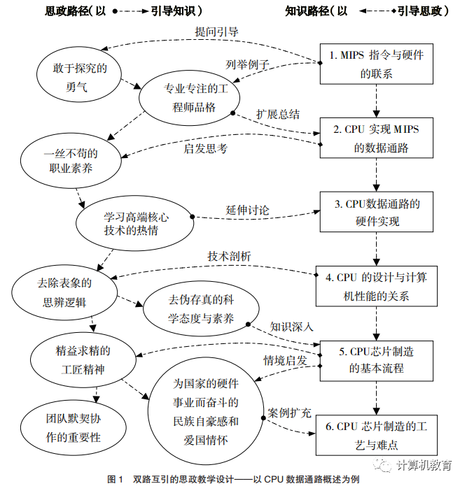 通过计算机硬件基础课程CPU数据通路概述的课堂实例,提出一种专业知识点与思政元素互相引导的双路互引教学方法与观点,其优势在于使专业知识与思政元素结合得更加协调并互相交融,这种思路的意义在于,对思政元素的隐式融入专业知识进行了有益的尝试。在未来,我们还要将本文的思想与方法运用到大数据专业的其他课程,以期能产生更多更好的课堂思政教学方法。