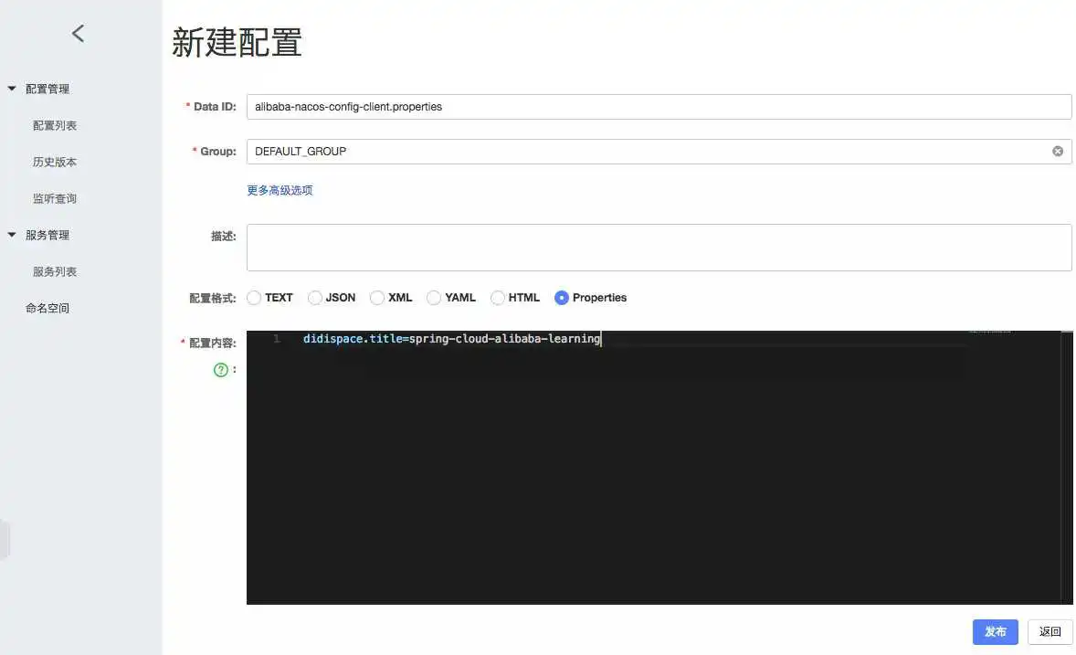 第一步:进入Nacos的控制页面,在配置列表功能页面中,点击右上角的“+”按钮,进入“新建配置”页面,如下图填写内容: