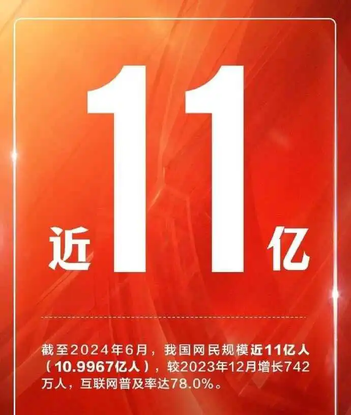 中国互联网络信息中心(CNNIC)今天(29日)发布了第54次《中国互联网络发展状况统计报告》(以下简称《报告》)。《报告》显示,截至2024年6月,我国网民规模近11亿人(10.9967亿人),较2023年12月增长742万人,互联网普及率达78.0%。上半年,我国互联网行业保持良好发展势头,互联网基础资源夯实发展根基,数字消费激发内需潜力,数字应用释放创新活力,更多人群接入互联网,共享数字时代的便捷和红利。